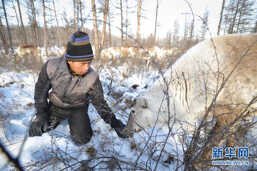 在內(nèi)蒙古大興安嶺根河林業(yè)局約安里林場,林場職工張國華在喂養(yǎng)馴鹿(2017年12月23日攝)。新華社記者李任滋攝