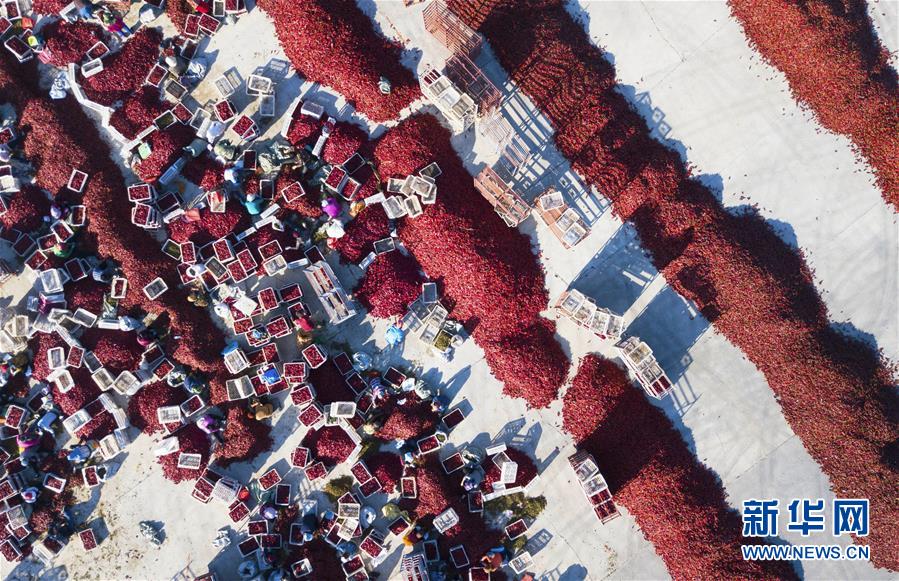 秋收時節(jié),吉林省白城市通榆縣的辣椒迎來豐收。火紅的辣椒和勞作的農(nóng)民構(gòu)成一幅幅美麗的豐收圖景。