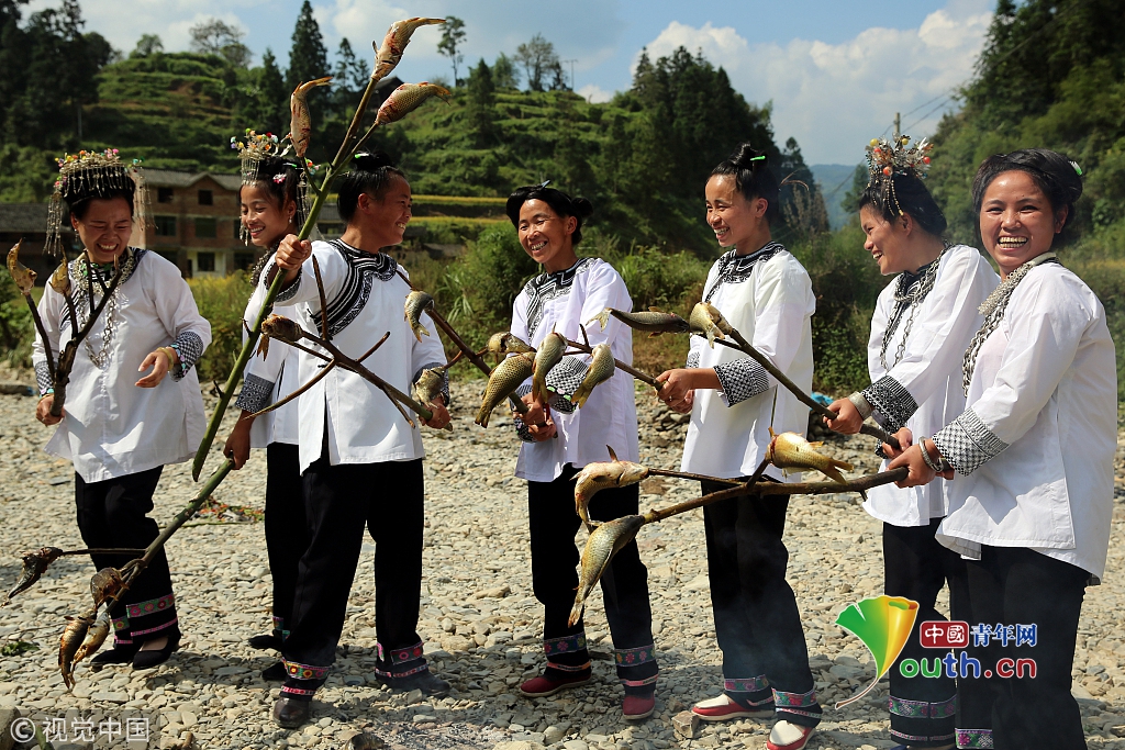 2016年9月17日,貴州省榕江縣平陽鄉(xiāng)硐里村七位侗家婦女們正燒魚。每年中秋時(shí)節(jié),當(dāng)?shù)囟弊逋_田放水,捉魚,全寨男女老少,野外生起篝火烤魚,用烤魚、米酒等,祭祀魚神,祈禱魚糧豐收的傳統(tǒng)民俗活動(dòng)。
