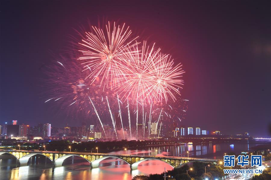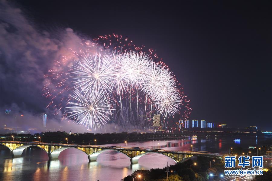 9月19日晚,湖南省長(zhǎng)沙市在湘江橘子洲舉辦焰火晚會(huì),絢麗的焰火與湘江兩岸的城市夜景交相輝映。