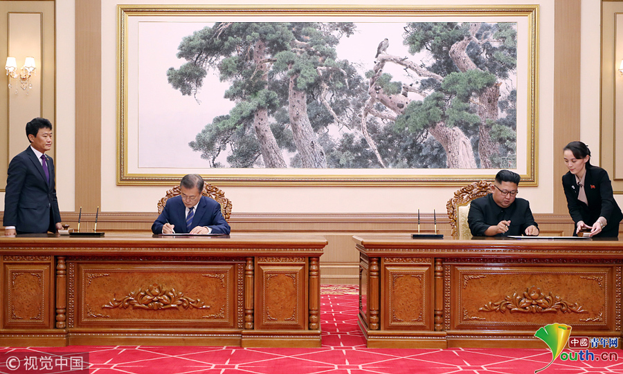 朝鮮最高領導人金正恩和韓國總統(tǒng)文在寅舉行第三次會晤的第二輪首腦會談。圖片作者:Yonhap News Agency