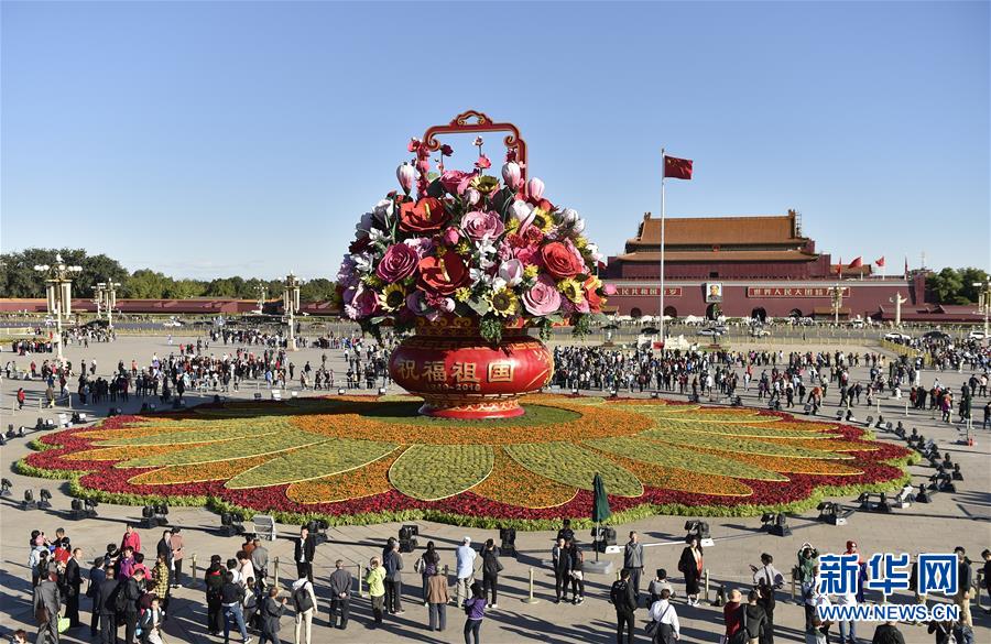 9月23日在北京天安門廣場拍攝的“祝福祖國” 巨型花籃。