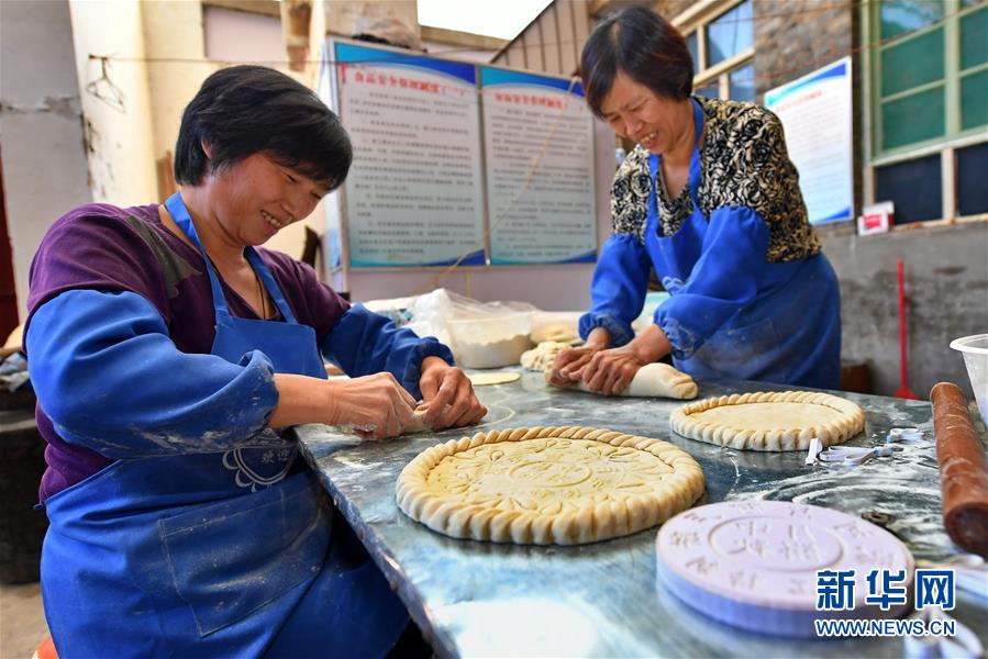 9月22日,段河村村民段粉拽(左)和段金花在制作月餅。 中秋節(jié)來臨之際,山西省晉城市澤州縣南嶺鄉(xiāng)段河村的段富善一家人忙碌起來,他們家制作的“柴火月餅”遠(yuǎn)近聞名。 “柴火月餅”起源于明清時(shí)期,餡料以糖搭配花生仁、芝麻、玫瑰等,有近10道制作工序,其中最有特色的是木柴烤制工藝,烘烤師傅必須掌握好火候,才能烤出外皮酥脆、餡料飄香的月餅。 新華社記者 曹陽(yáng) 攝