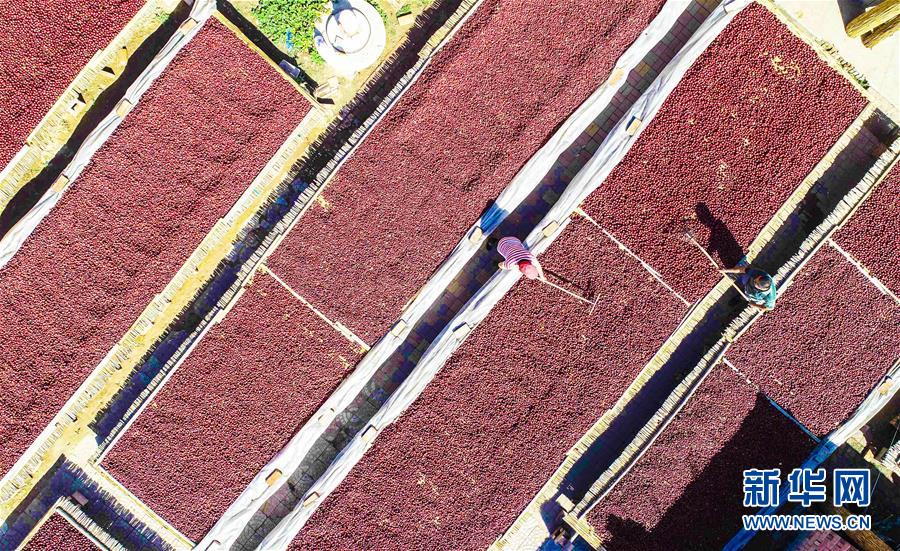 9月22日,河北省棗強(qiáng)縣棗強(qiáng)鎮(zhèn)孟家莊村的棗農(nóng)在晾曬紅棗(無人機(jī)拍攝)。 近日,河北省棗強(qiáng)縣的2000多畝棗園迎來收獲季,棗農(nóng)們搶抓農(nóng)時(shí),采摘、篩選、晾曬紅棗,樂享秋收的快樂。 新華社記者李曉果攝