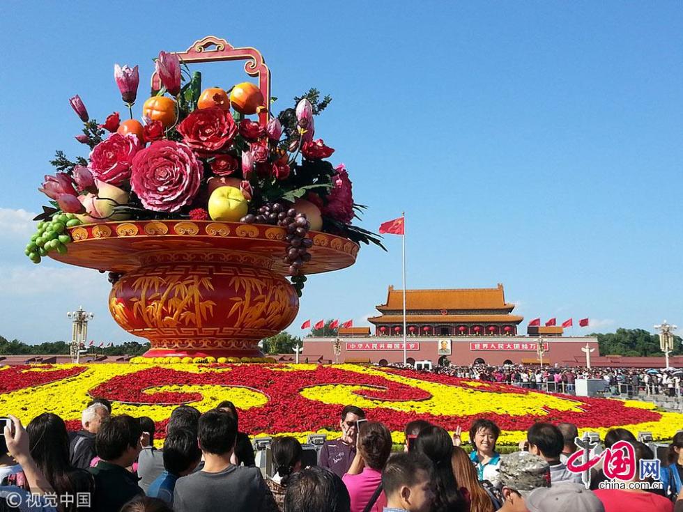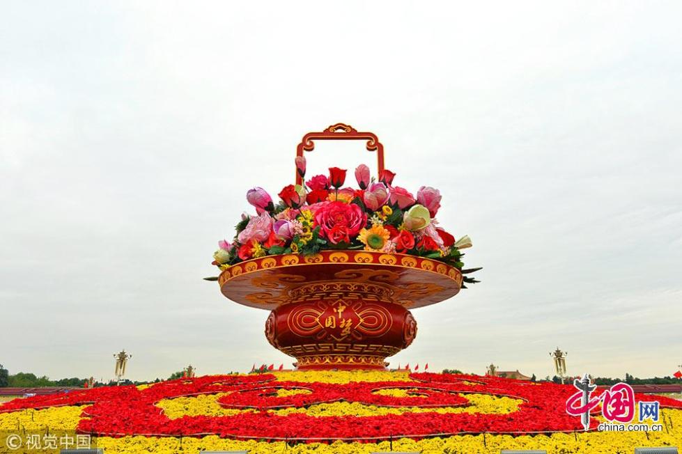 9月23日在北京天安門廣場(chǎng)拍攝的“祝福祖國(guó)” 巨型花籃。