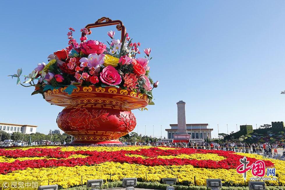 2015年的大花籃規(guī)格與往年相似,花籃依然采用正紅色,同時(shí)用金色祥云描邊,提梁為紅色鑲嵌金邊的長(zhǎng)方形,頂端再裝飾一朵凸起的祥云?;ɑ@里已經(jīng)有20支左右的花朵,有大紅色的牡丹、玫紅色的月季,再調(diào)和以亮黃色的向日葵,粉色的玉蘭從花籃東側(cè)旁逸斜出,兩束紅梅分別繞著花籃的一側(cè)提梁向上伸展,中間點(diǎn)綴著些粉色桃花?;ɑ@下方放著白花黃蕊的水仙和一些綠色植物,整體配色典雅大氣,富有節(jié)日氣氛。