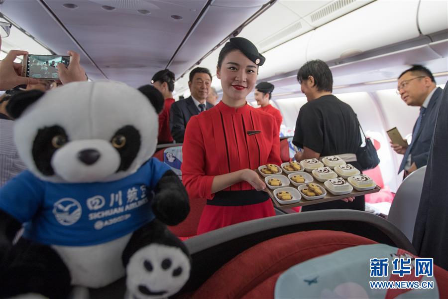 9月26日,在以色列特拉維夫本·古里安國際機場,四川航空公司空乘人員在機上展示熊貓主題的小吃。 新華社記者郭昱攝