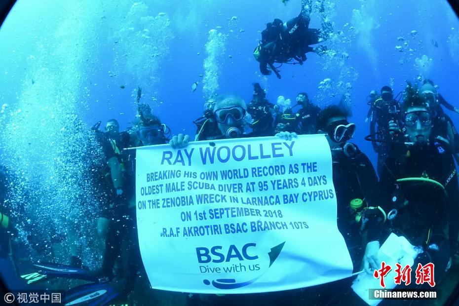當(dāng)?shù)貢r(shí)間2018年9月1日,塞浦路斯,95歲的英國(guó)潛水員雷·伍利(Ray Woolley)以44分鐘下潛40.5米的成績(jī)打破了自己94歲達(dá)成的記錄(41分鐘下潛38.1米),二度刷新了世界上年齡最大的男性潛水員最好成績(jī)。在此次下潛中,這位二戰(zhàn)退伍老兵對(duì)距塞浦路斯南部城鎮(zhèn)拉納卡約2公里處的海域進(jìn)行了探索,1980年一艘名為“芝諾比亞號(hào)”(Zenobia)的貨船在這里進(jìn)行首次航行時(shí)沉沒(méi)。圖片來(lái)源:視覺(jué)中國(guó)