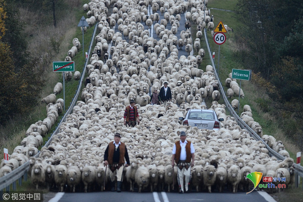 2018年9月27日訊(具體拍攝時(shí)間不詳),波蘭,浩浩蕩蕩的綿羊大軍為了趕在冬天之前回到農(nóng)場(chǎng)過冬,阻斷了鄉(xiāng)村的主車道。