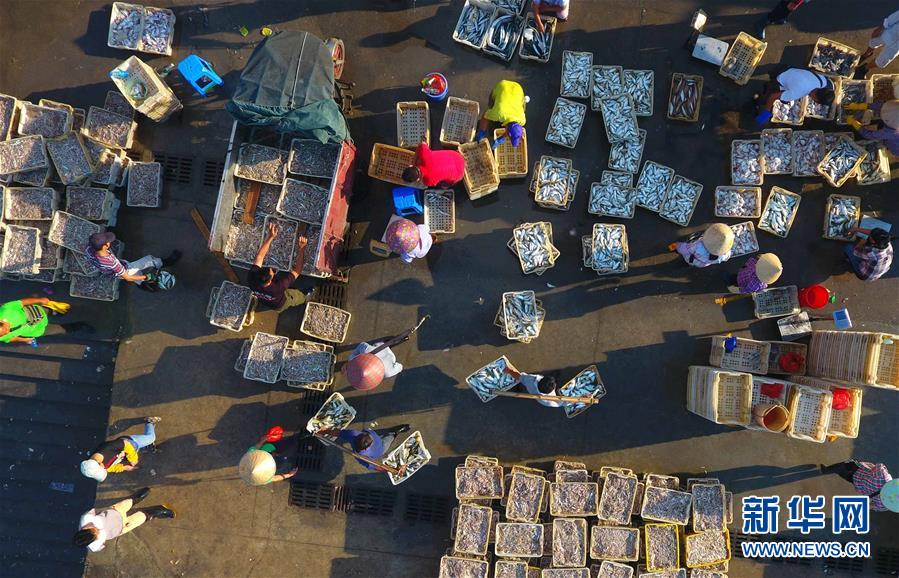 返港漁民在廣西北海市僑港鎮(zhèn)電建漁港的碼頭卸貨(9月26日無人機(jī)拍攝)。 新華社記者 黃孝邦 攝