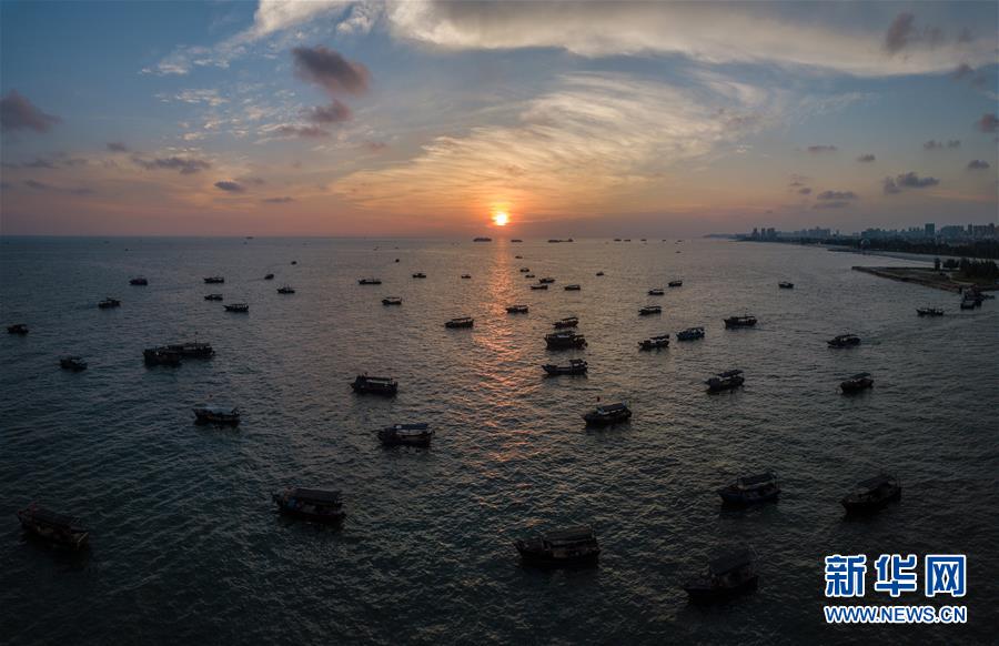 這是夕陽(yáng)西下時(shí),漁船從廣西北海市銀灘風(fēng)景區(qū)出海作業(yè)(9月26日無人機(jī)拍攝,拼接照片)。 新華社記者 李鑫 攝
