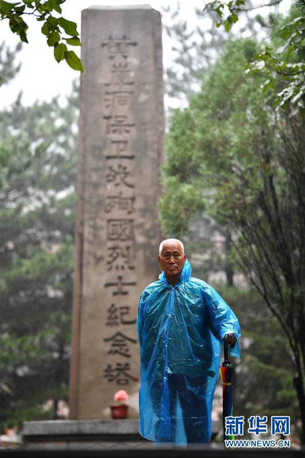 在黃崖洞烈士陵園,趙乃堂在黃崖洞保衛(wèi)戰(zhàn)殉國(guó)烈士紀(jì)念塔前(9月18日攝)。