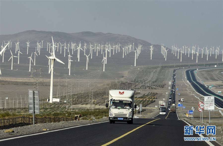 汽車行駛在新疆吐魯番市郊區(qū)風(fēng)力發(fā)電場(chǎng)一旁的公路上(9月22日攝)。新華社記者趙戈 攝