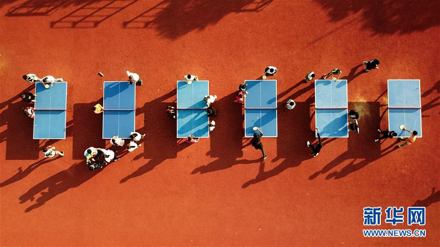 學(xué)生在安徽鳳陽小崗村小崗學(xué)校內(nèi)打乒乓球(9月26日無人機拍攝)。 新華社記者 張端攝