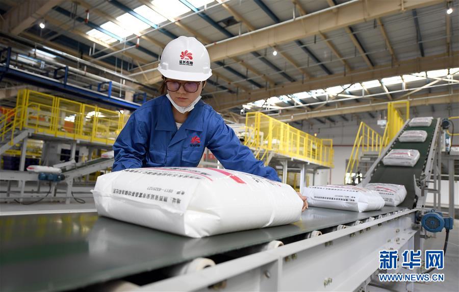 延安煤油氣資源綜合利用項(xiàng)目包裝車(chē)間的工作人員進(jìn)行產(chǎn)品包裝檢查(9月28日攝)。新華社記者劉瀟攝