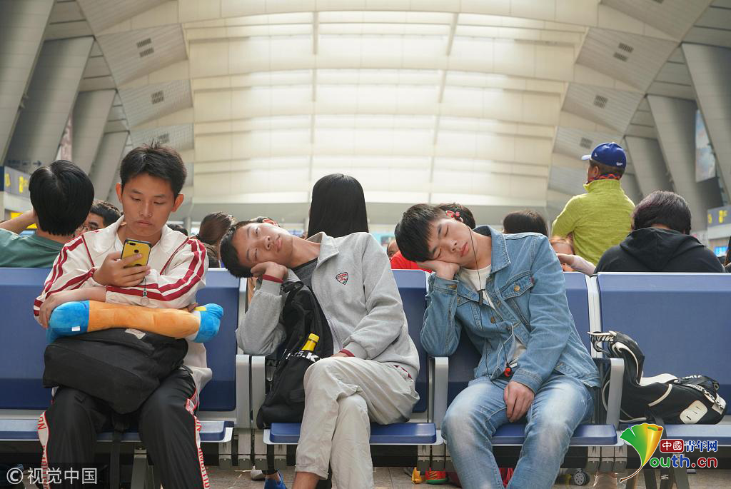 2018年10月1日,兩名旅客在北京南站內(nèi)候車時打盹。當天是國慶假期首日,北京南站迎來客流高峰。此前,據(jù)北京鐵路局預(yù)計,國慶黃金周將發(fā)送旅客1168萬人,同比增加19.9萬人。其中10月1日為出行高峰日,預(yù)計當天發(fā)送旅客143萬人,同比增加4.7萬人。圖片作者:張興龍