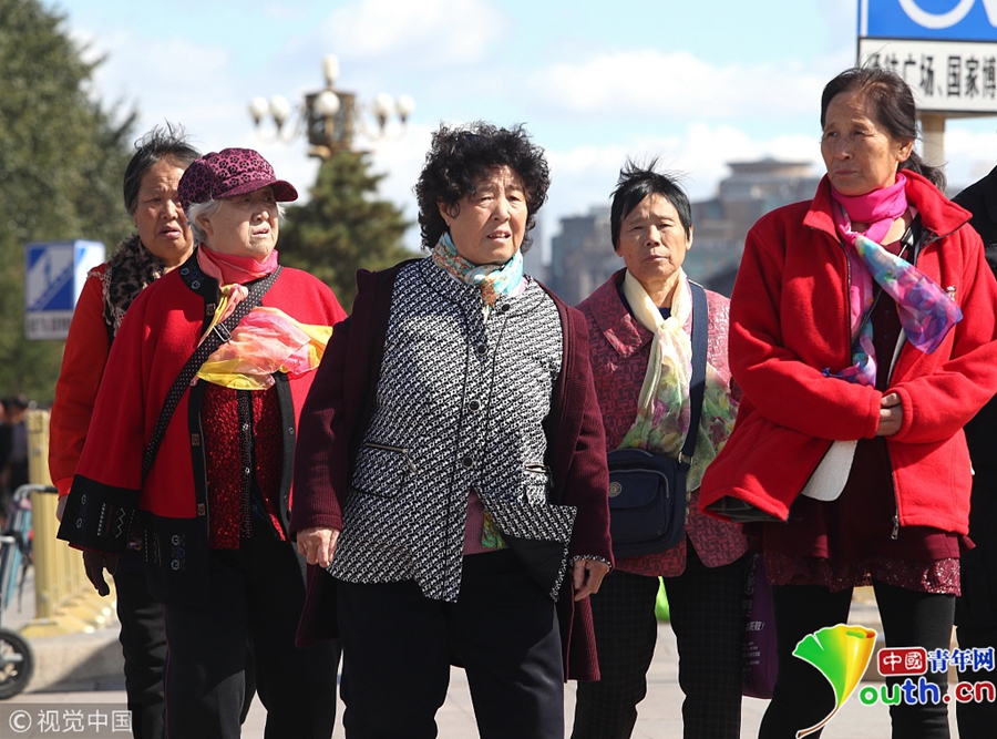 中國青年網(wǎng)北京10月10日電 2018年10月9日,北京,游客紛紛著秋冬裝游覽天安門廣場。當(dāng)天北京冷空氣來襲。圖片來源:視覺中國