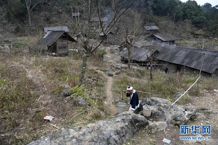 在廣西南丹縣里湖瑤族鄉(xiāng)仁廣村,一名白褲瑤族同胞在挑水(1月12日攝)。如今,搬遷后的白褲瑤族同胞都用上了自來(lái)水。新華社記者 周華 攝