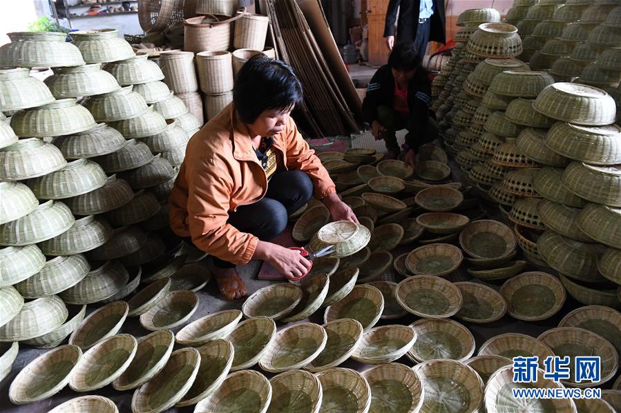 10月11日,在廣西靈山縣平南鎮(zhèn)硤木村一家竹編企業(yè),員工在加工竹編產(chǎn)品。新華社記者 陸波岸 攝