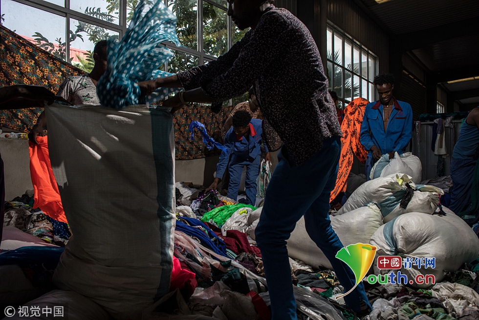東方工業(yè)園的中國紡織印染廠,當(dāng)?shù)毓蛦T在整理廢棄的布頭。
