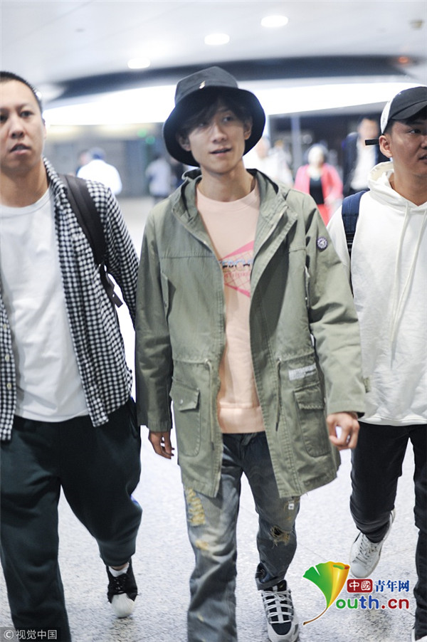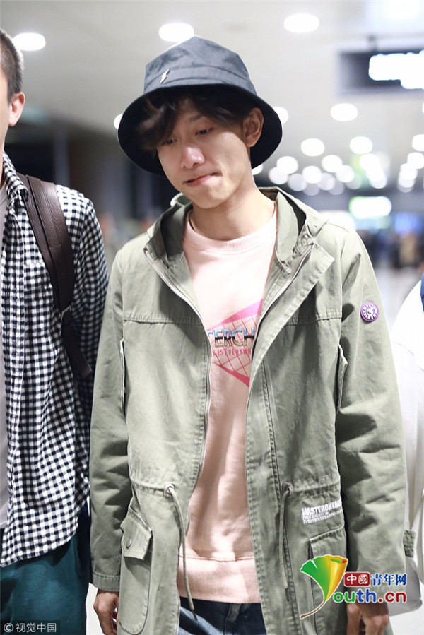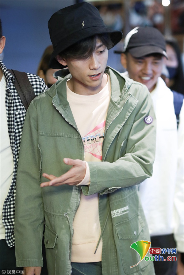 2018年10月14日,上海,張一山抵達上海機場。張一山戴漁夫帽眼袋嚴重瞬間老十歲, 用手擋臉?biāo)撇辉干乡R。