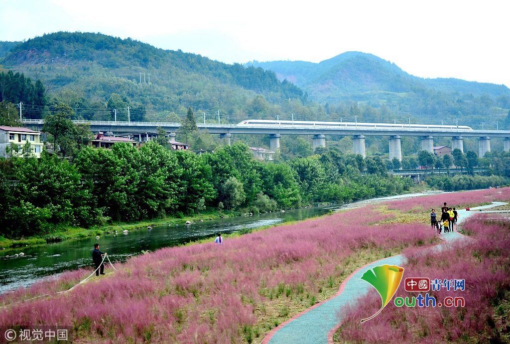 2018年10月14日,陜西漢中,西成高鐵漢中市寧強(qiáng)縣高寨子路段上的一列動車正從紅艷艷的蘆葦花海附近駛過。