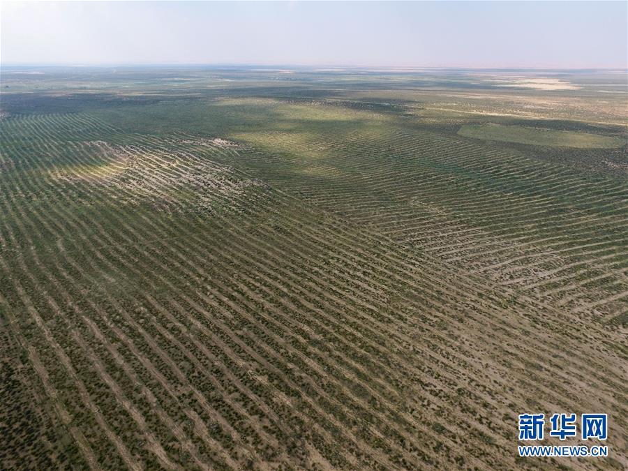 庫(kù)布其沙漠中的人工沙障(8月2日無(wú)人機(jī)拍攝)。 新華社記者劉磊攝