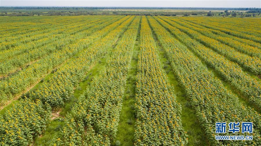 內(nèi)蒙古杭錦旗沙日召嘎查牧民白音道爾計(jì)種植的甘草等沙生植物(7月31日無(wú)人機(jī)拍攝)。 新華社記者劉磊攝