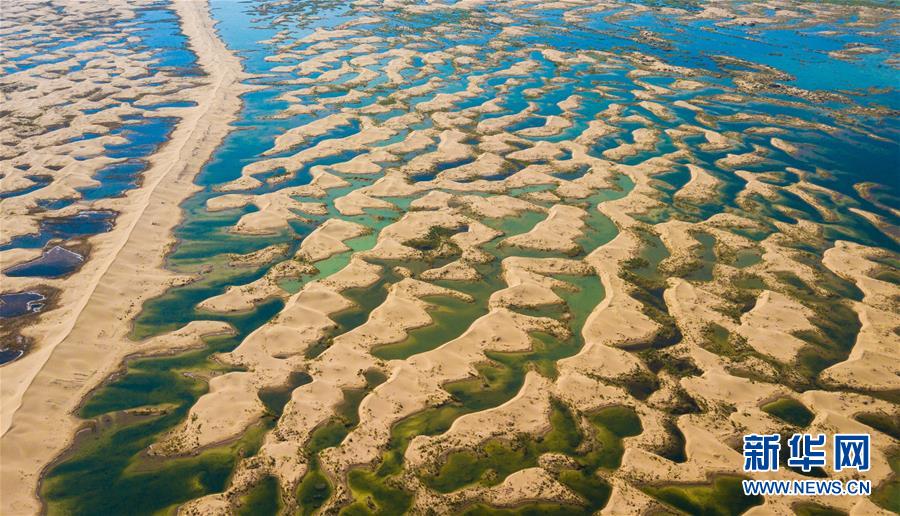 俯瞰恩格貝月亮湖。(新華網(wǎng) 王宇 攝)