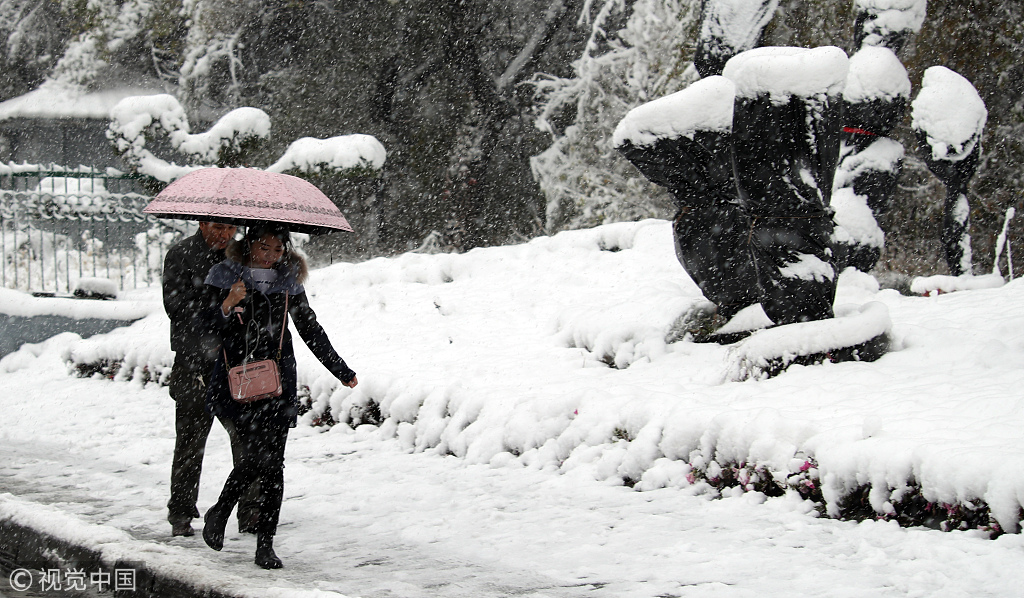 10月18日,行人穿行在烏魯木齊積雪覆蓋的人行道上。當(dāng)日,新疆烏魯木齊迎來一場降雪。 新華社記者 江文耀 攝