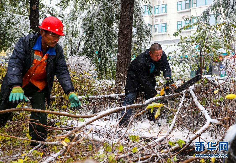 10月18日,工作人員在烏魯木齊清理被積雪壓斷的樹(shù)木。當(dāng)日,新疆烏魯木齊迎來(lái)一場(chǎng)降雪。 新華社記者 江文耀 攝