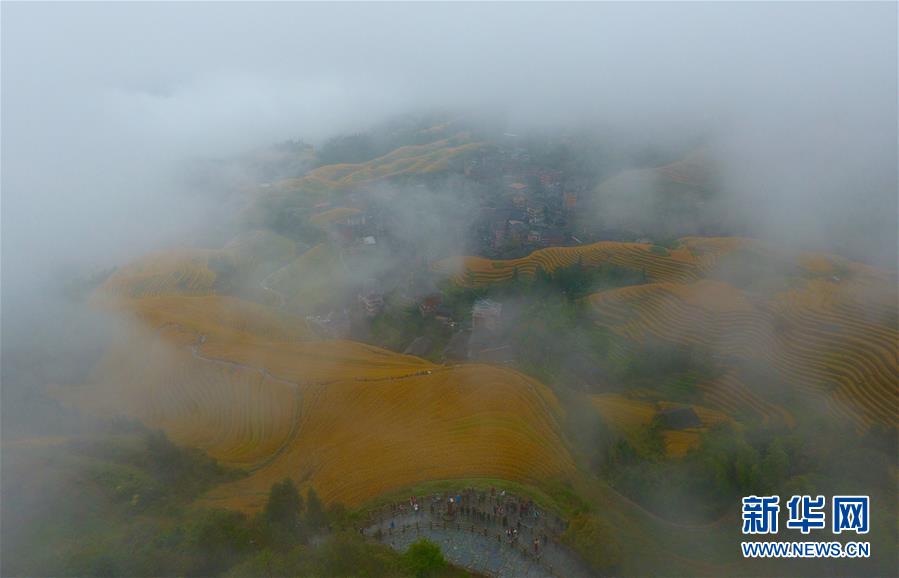 10月16日,游客在秋雨中欣賞龍脊梯田秋色(無(wú)人機(jī)拍攝)。金秋時(shí)節(jié),廣西龍勝各族自治縣龍脊梯田美如畫(huà)卷。 新華社記者 黃孝邦 攝
