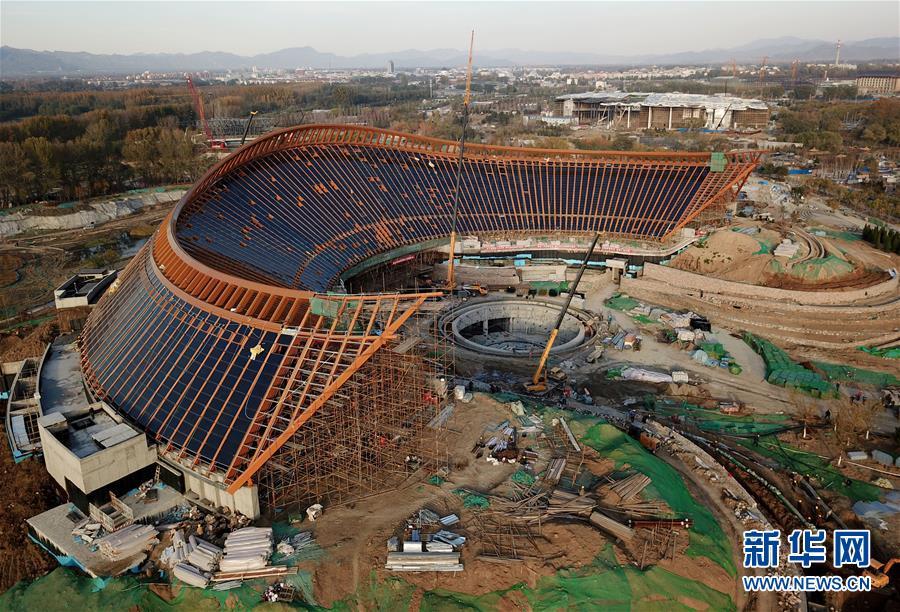 10月18日拍攝的建設(shè)中的北京世園會(huì)中國(guó)館(無(wú)人機(jī)拍攝)。新華社記者 羅曉光 攝