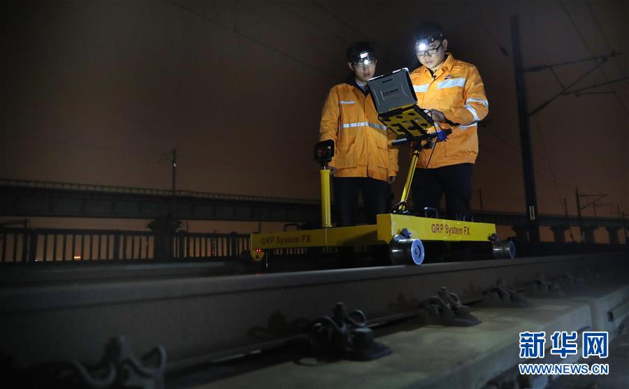 10月18日,劉訓(xùn)飛(右)和郎海鵬在滬寧城際上海安亭北線路所42#道岔上使用軌檢小車檢測線路。 新華社記者 方喆 攝