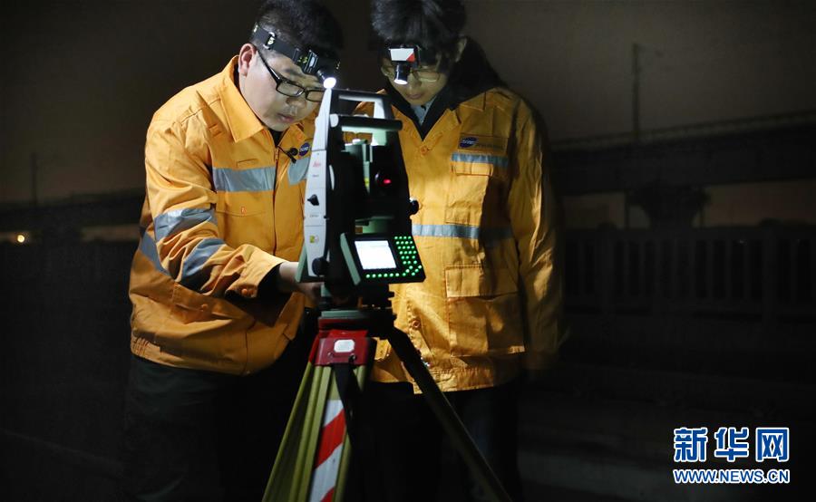 10月18日,劉訓(xùn)飛(左)在滬寧城際上海安亭北線路所42#道岔上進行線路檢測作業(yè)時,向徒弟郎海鵬講解全站儀設(shè)置方法。新華社記者 方喆 攝