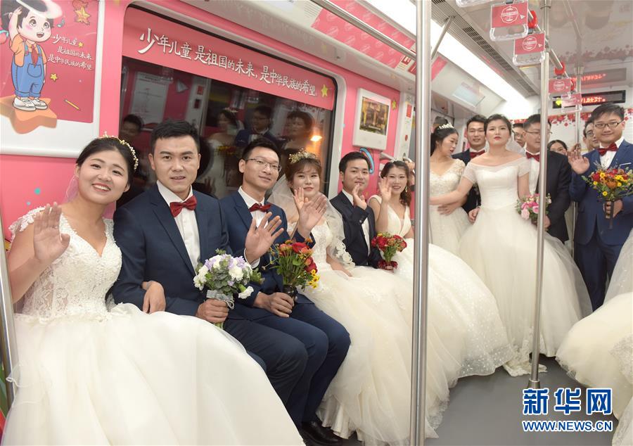 10月18日,在合肥市地鐵一號線車廂內,新人們合影留念。 當日,中鐵四局集團城市軌道交通工程分公司的18對新人在安徽合肥地鐵一號線的車廂里舉行了一場集體婚禮儀式。 新華社記者 郭晨 攝