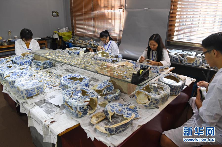 在江西景德鎮(zhèn),工作人員修復(fù)明代瓷枕(9月20日攝)。 新華社記者 萬象 攝