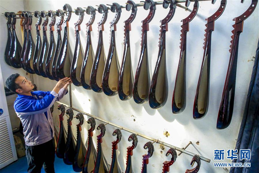 10月20日,在河北省饒陽(yáng)縣一家民族樂(lè)器廠,工人擺放琵琶半成品。