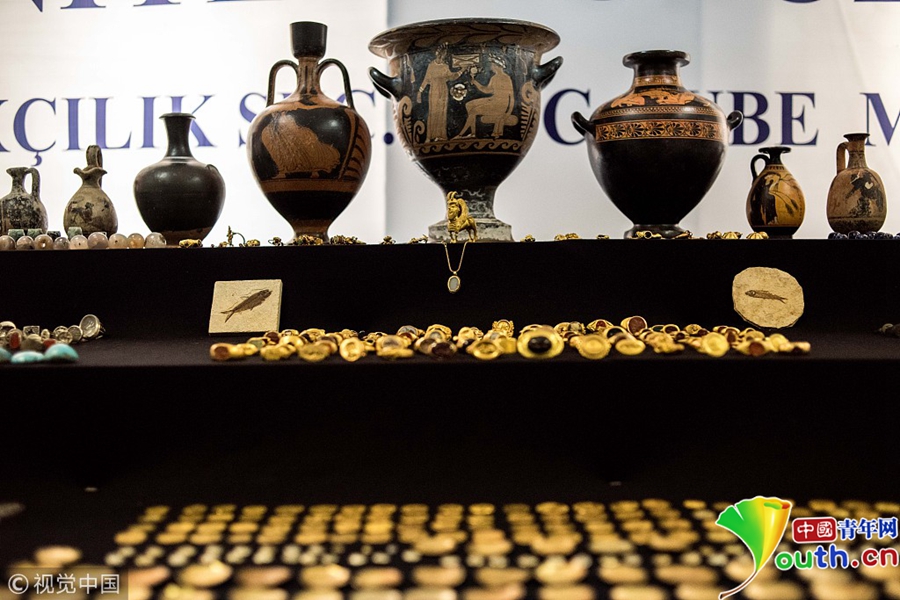 中國青年網(wǎng)北京10月21日電 當?shù)貢r間2018年10月19日,土耳其伊斯坦布爾,繳獲的走私文物在伊斯坦布爾展出。以伊斯坦布爾為主的安全委員會展開打擊文物走私行動,取得歷史性收獲,在全國12個省份繳獲了攻擊1.4萬件文物,其中包括金幣、羅馬時期的墓碑、呂底亞銀幣、拜占庭硬幣以及羅馬時期的劍等。圖片來源:視覺中國