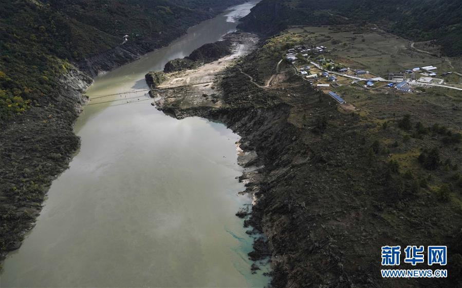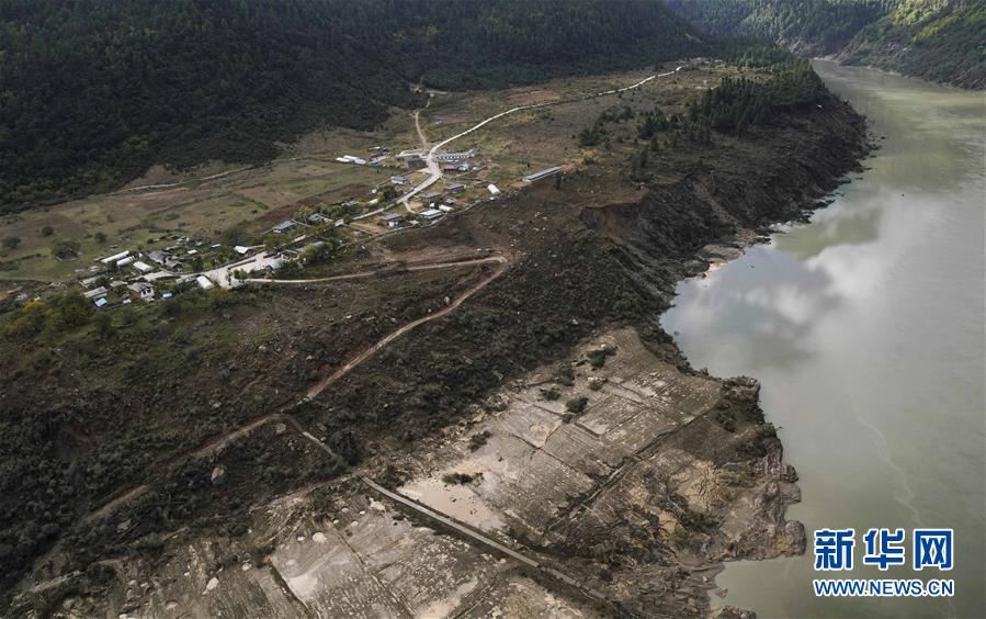 10月20日拍攝的西藏雅魯藏布江米林縣堰塞湖自然過流后的加拉村。 10月19日13時(shí)30分,西藏雅魯藏布江米林縣堰塞湖開始自然過流。記者從應(yīng)急管理部牽頭的聯(lián)合工作組獲悉,截至20日7時(shí),雅魯藏布江堰塞湖壩前水位已下降56米,估算留存水量1.6億立方米,堰塞湖洪水威脅得到緩解,防洪安全風(fēng)險(xiǎn)大大減輕,并將繼續(xù)降低。 10月20日,記者乘坐直升機(jī)從空中拍攝了雅魯藏布江堰塞湖自然過流的畫面。 新華社記者普布扎西攝