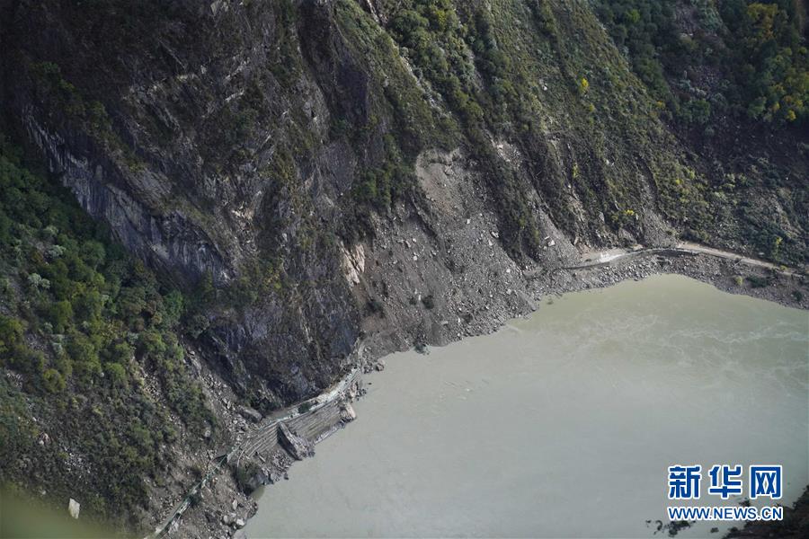 10月20日,西藏雅魯藏布江米林縣堰塞湖自然過流后,露出損毀的道路。 10月19日13時(shí)30分,西藏雅魯藏布江米林縣堰塞湖開始自然過流。記者從應(yīng)急管理部牽頭的聯(lián)合工作組獲悉,截至20日7時(shí),雅魯藏布江堰塞湖壩前水位已下降56米,估算留存水量1.6億立方米,堰塞湖洪水威脅得到緩解,防洪安全風(fēng)險(xiǎn)大大減輕,并將繼續(xù)降低。 10月20日,記者乘坐直升機(jī)從空中拍攝了雅魯藏布江堰塞湖自然過流的畫面。 新華社記者普布扎西攝