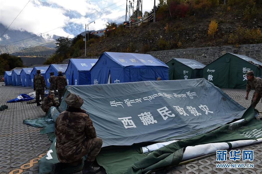 10月19日,救援人員在米林縣派鎮(zhèn)尼定村搭建安置點(diǎn)。 記者從西藏自治區(qū)林芝加拉村雅魯藏布江堰塞湖災(zāi)情應(yīng)急搶險(xiǎn)工作第二場(chǎng)新聞發(fā)布會(huì)上獲悉,19日13時(shí)30分,雅魯藏布江米林縣堰塞體上游水位超過堰塞體,開始自然過流,上游水位正在緩慢下降。目前,各項(xiàng)搶險(xiǎn)救援工作正在有序開展。 新華社記者 覺果 攝