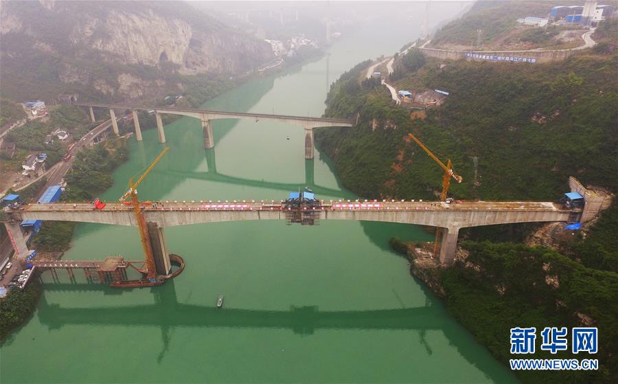 在重慶涪陵拍攝的渝懷鐵路涪秀二線(xiàn)重點(diǎn)工程——烏江右線(xiàn)大橋(10月23日無(wú)人機(jī)拍攝)。 10月23日,由中鐵四局承建的渝懷鐵路涪秀二線(xiàn)重點(diǎn)工程——烏江右線(xiàn)大橋主跨成功合龍,標(biāo)志著大橋主體工程全部順利結(jié)束。烏江右線(xiàn)大橋項(xiàng)目全程460.1米,主跨192米,跨越烏江和319國(guó)道。在兩年多的建設(shè)過(guò)程中,施工人員攻克了“不等高墩”“不對(duì)稱(chēng)邊跨”“邊跨入隧”等多個(gè)技術(shù)難題。 新華社記者王全超攝