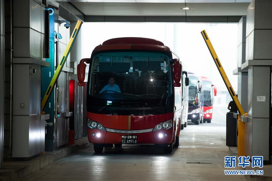 10月24日,跨境巴士在澳門口岸離境車道上通關(guān)。當日9時,港珠澳大橋正式通車。 新華社記者張金加攝