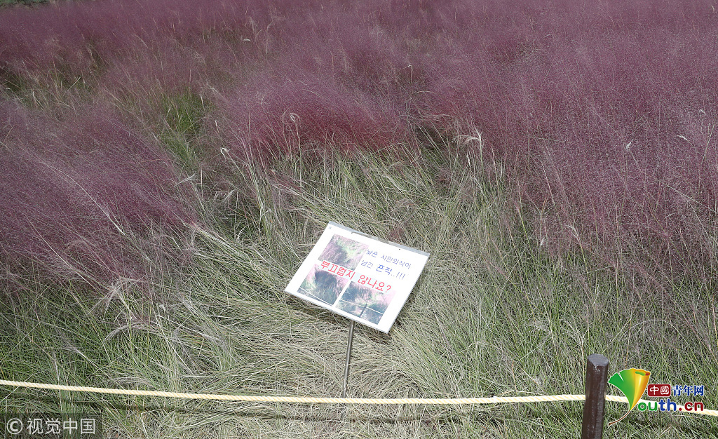 當?shù)貢r間2018年10月16日,韓國蔚山,近日,蔚山公園大片粉黛亂子草盛開,粉紅花海浪漫十足,但部分花海遭游客隨意踩踏。公園并沒有修復遭破壞區(qū)域,而是用繩索圍起并掛上批判性告示,呼吁游客腳下留情。圖片作者:Yonhap News Agency