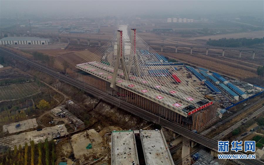 10月25日,唐山市二環(huán)路項(xiàng)目上跨津山鐵路斜拉橋在轉(zhuǎn)體中(無(wú)人機(jī)拍攝)。 當(dāng)日,河北省唐山市二環(huán)路項(xiàng)目上跨津山鐵路斜拉橋轉(zhuǎn)體成功。據(jù)介紹,該橋總長(zhǎng)927.5米,主橋由斜拉轉(zhuǎn)體橋和轉(zhuǎn)體T構(gòu)橋組成,轉(zhuǎn)體總重5.1萬(wàn)噸,其中斜拉轉(zhuǎn)體橋重3.3萬(wàn)噸,主塔高達(dá)80.5米,為曲線變截面“雙人字”形空心塔,自上而下共有128根斜拉索。 新華社記者楊世堯攝