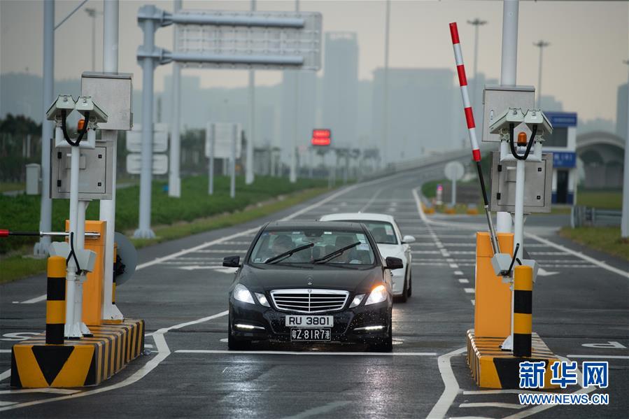 10月24日,首輛私家車在澳門口岸離境車道上通關。當日9時,港珠澳大橋正式通車。 新華社記者張金加攝