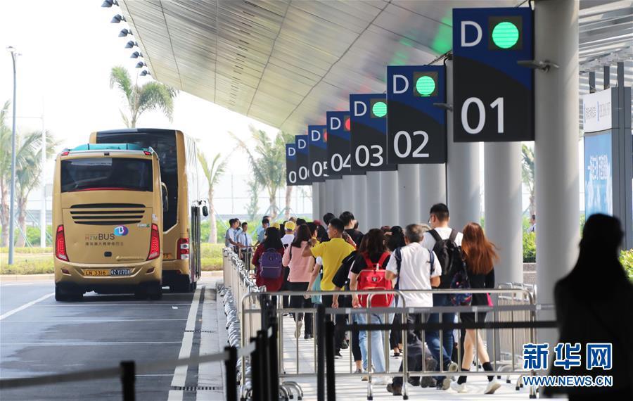 10月24日,跨境巴士在澳門口岸離境車道上通關。當日9時,港珠澳大橋正式通車。 新華社記者張金加攝