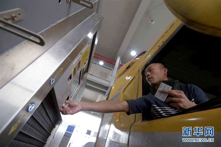 10月24日,港珠澳大橋珠海公路口岸通車的首票進口貨物貨車司機在抵達一站式貨車進境驗放通道時按指紋。 當日,港珠澳大橋正式通車。