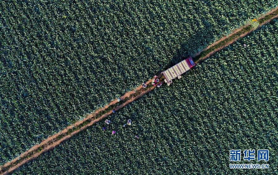10月29日,樂亭縣馬頭營鎮(zhèn)馬頭營村的農(nóng)民在收獲菜花(無人機(jī)拍攝)。 新華社記者楊世堯攝